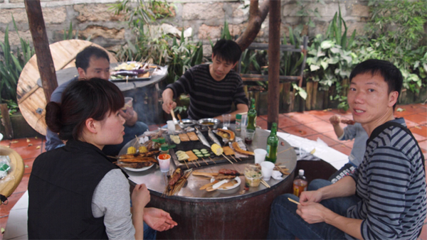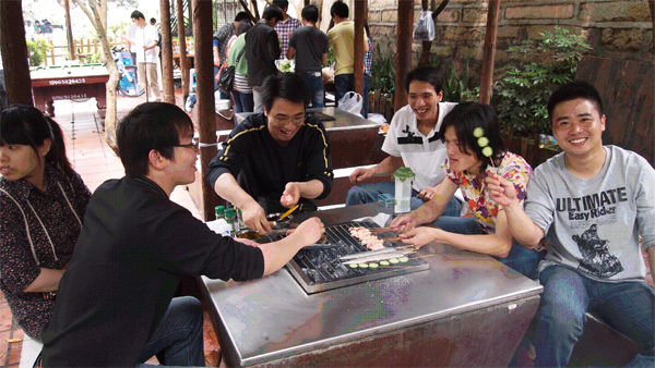 此次燒烤準備有雞翅,秋刀魚、肉串、香腸、玉米,茄子等多種多樣的食材供大家一展身手,燒烤開始時,大家都迫不及待的動起手來,你一串雞翅,我一串肉串,烤的可真開心。有的還這里竄個雞翅吃,那里竄個香腸吃,雖說“懶人好吃”,倒也其樂融融。